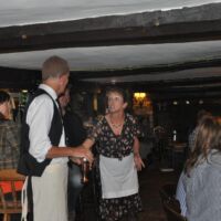 Our first booking! Karen Young (foreground centre) and Tim Budd (far right) are grandchildren of former landlord Sydney Matters